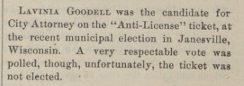 In April of 1875, 45 years before women won the right to vote, Lavinia Goodell ran for Janesville City Attorney on the Temperance, or Anti-License, ticket. It is unknown when she made the decision to run. Her diary entry for election day reported, “I run for City Atty. on Temperance ticket today. Don’t know how many votes I got, but N got elected, which I suppose will make him amiable.” The “N” in question was Pliny Norcross, Lavinia’s sometime legal mentor/sometime adversary. The following day, Lavinia reported that she had received about 60 votes, a very respectable showing from Janesville’s all male voting contingent.